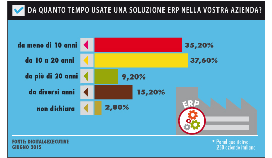 Secondo la ricerca, quasi la metà delle aziende (46,80%) ha adottato una soluzione ERP da molto più di una decina d’anni, con delta temporali che arrivano in alcuni casi anche 20 anni (9,20%).