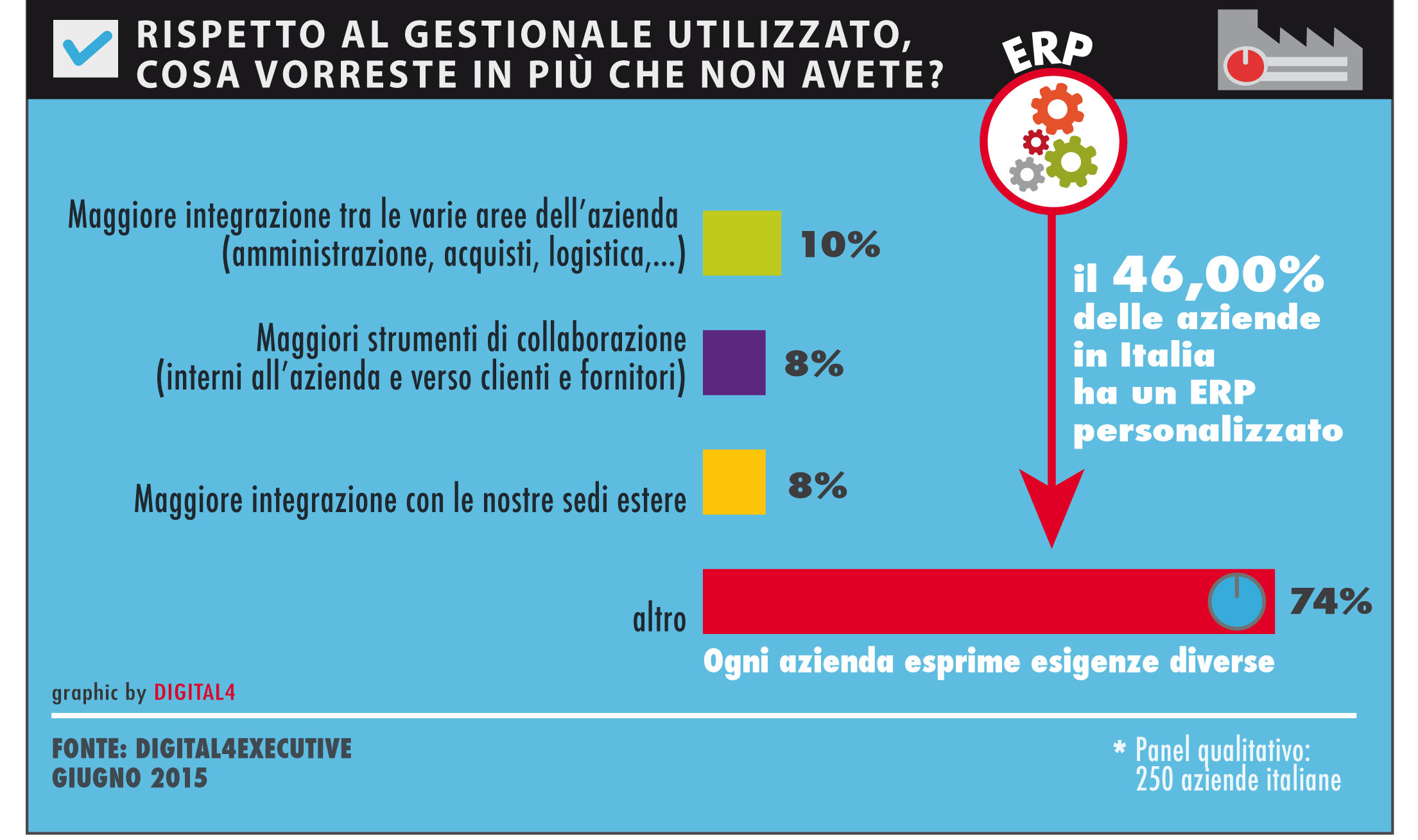 Lo si evince da una gamma di risposte estremamente puntuale e diversificata, che va da una domanda di strumenti di BI e di strumenti di analisi a un miglioramento dell’interfaccia utente, dalla richiesta di processi di gestione della qualità per le risorse umane a una volontà di avere una gestione della tesoreria integrata all’ERP, per arrivare a un desiderio di una reportistica più avanzata rispetto a quella in essere.