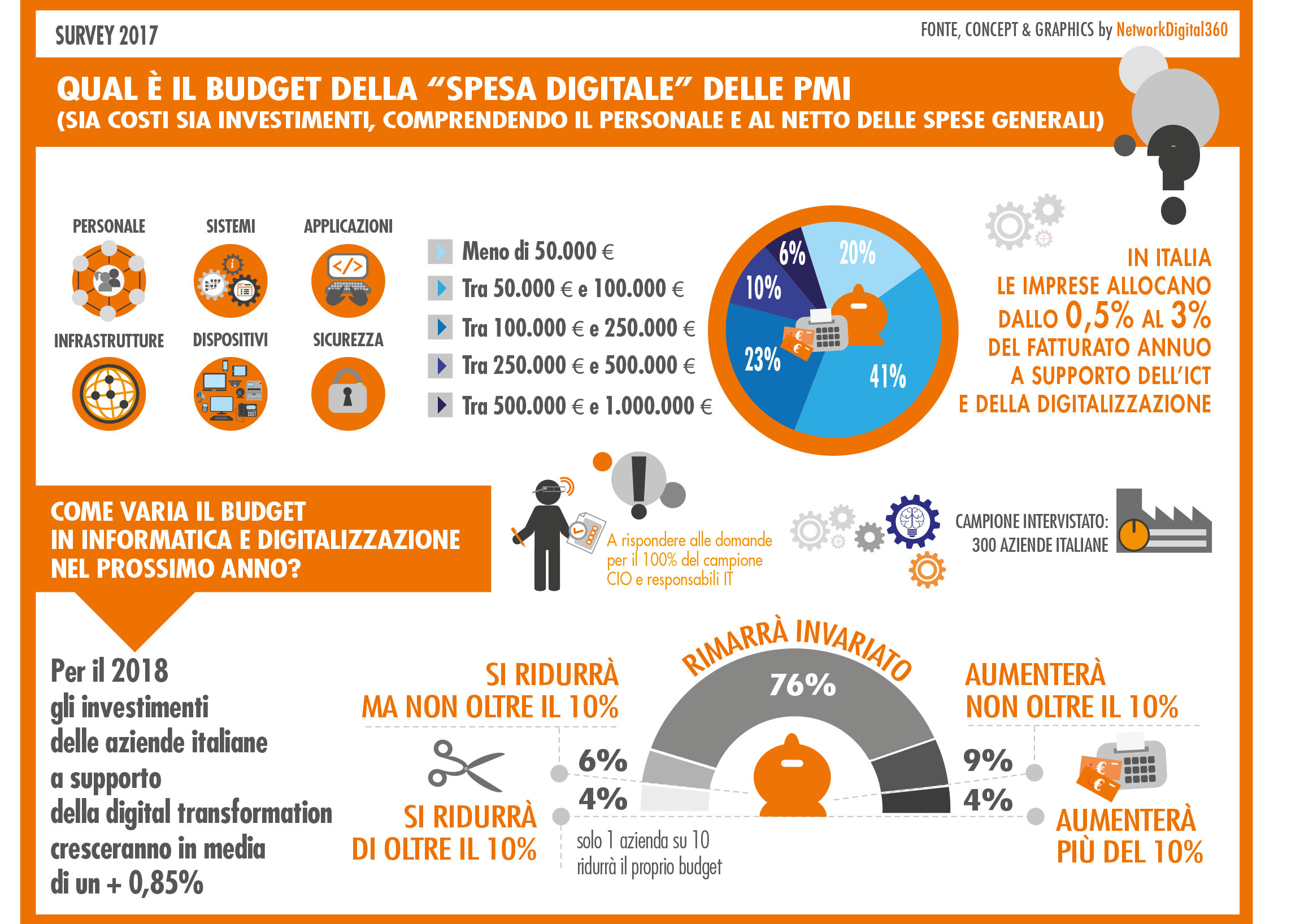 La survey sulle PMI italiane racconta atteggiamenti diversi rispetto all’innovazione digitale. Il 20% delle aziende coinvolte alloca meno di 50mila euro, il 41% investe tra i 50mila e i 100mila euro e il 23% destina un budget compreso tra 100mila e 250mila euro. Infine, a stanziare budget oltre 250mila euro è il 16% delle aziende del panel. La buona notizia è che le stime per il 2018 dicono che solo un’azienda su 10 ridurrà il proprio budget, mentre il 13% lo aumenterà.