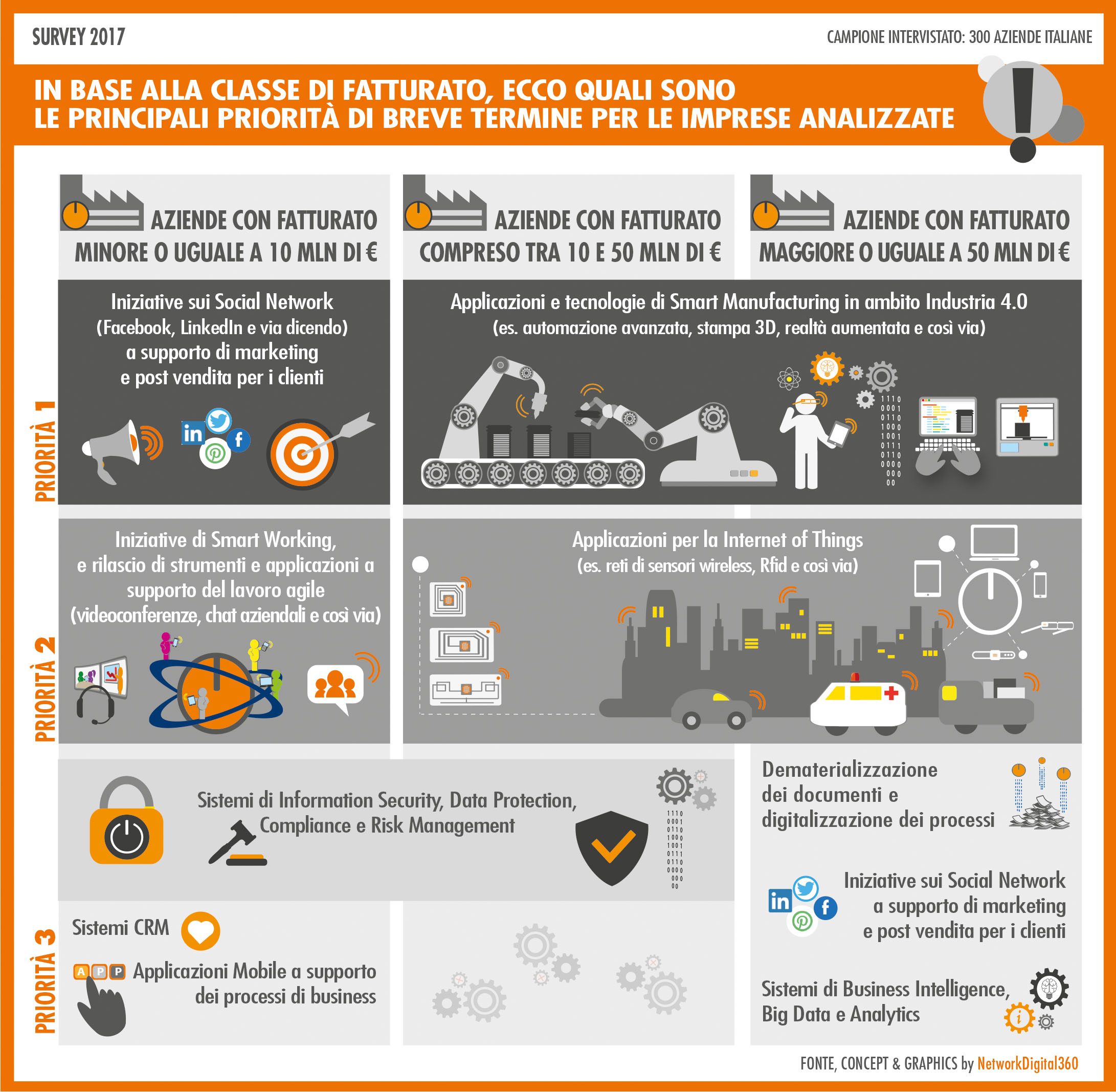 Il tema della Internet of Things, dello smart manufacturing e della smart supply chain che implica l’uso di una nuova intelligenza gestionale e applicativa in chiave 4.0 è la prima priorità delle PMI con maggiore disponibilità di budget. Per le aziende con una disponibilità economica più ridotta, in priorità 1 troviamo invece l’innovazione sui social network a supporto di marketing e post-vendita, e in priorità 2 lo smart working.