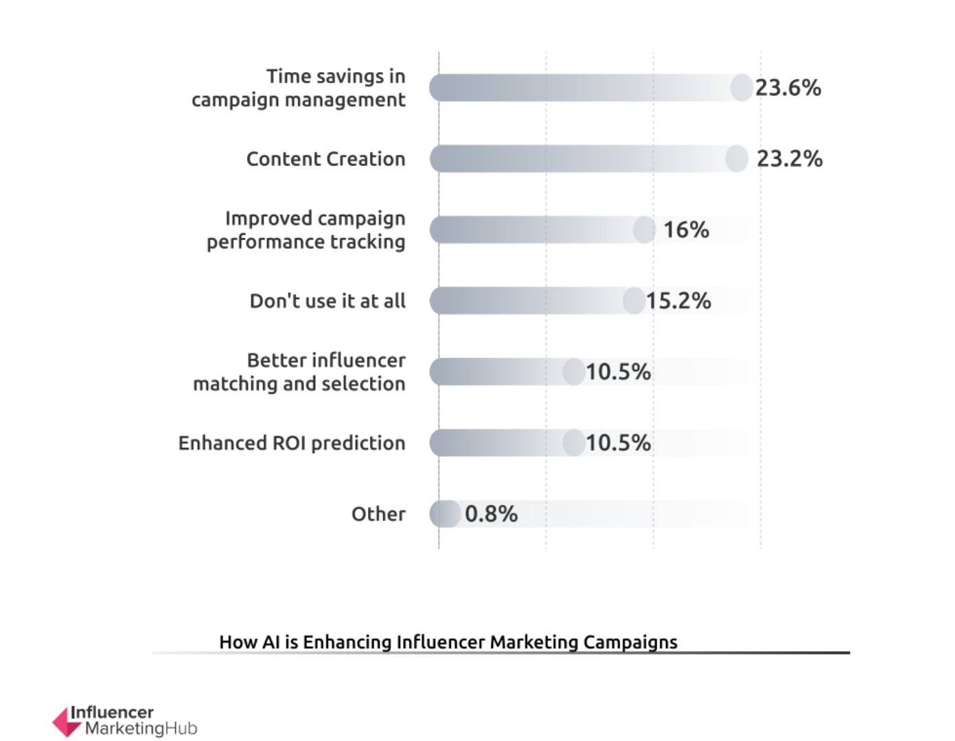 L’introduzione dell’intelligenza artificiale nel ciclo operativo dell’influencer marketing sta rivoluzionando l’intero settore. Stando ai dati dello studio realizzato da Influencer Marketing Hub, 64 leader su 100 riconoscono che l’AI ha migliorato sensibilmente le performance delle loro campagne. Le aree che beneficiano maggiormente includono: gestione del tempo (23,6%), creazione di contenuti (23,2%), monitoraggio delle performance (16%) e selezione degli influencer (10,5%).