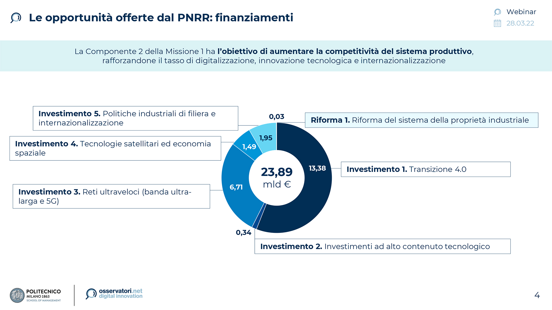 Il webinar si è concluso con un momento di riflessione sulle opportunità che riserva il PNRR nel processo di digitalizzazione delle PMI italiane. Il prof. Corso ha sottolineato che è la Componente 2 della Missione 1, “Digitalizzazione, innovazione e competitività del sistema produttivo”, la misura più mirata a supportare la trasformazione digitale delle imprese. Con 23,89 miliardi direttamente destinati alle aziende private, l’obiettivo principale è aumentare la competitività del sistema produttivo rafforzando il tasso di digitalizzazione, innovazione, tecnologia e internazionalizzazione. Guardando la suddivisione dell’investimento balza all’occhio che 13,38 miliardi di 23,89 siano dedicati proprio alla Transizione 4.0 che finanzia l’acquisto di beni capitali, che permette di portare avanti progetti di ricerca, sviluppo e innovazione connessi al business, e che supporta le attività di formazione e crescita delle competenze con piani ad hoc per la riqualificazione del management e il reskilling del personale per perseguire l’innovazione.