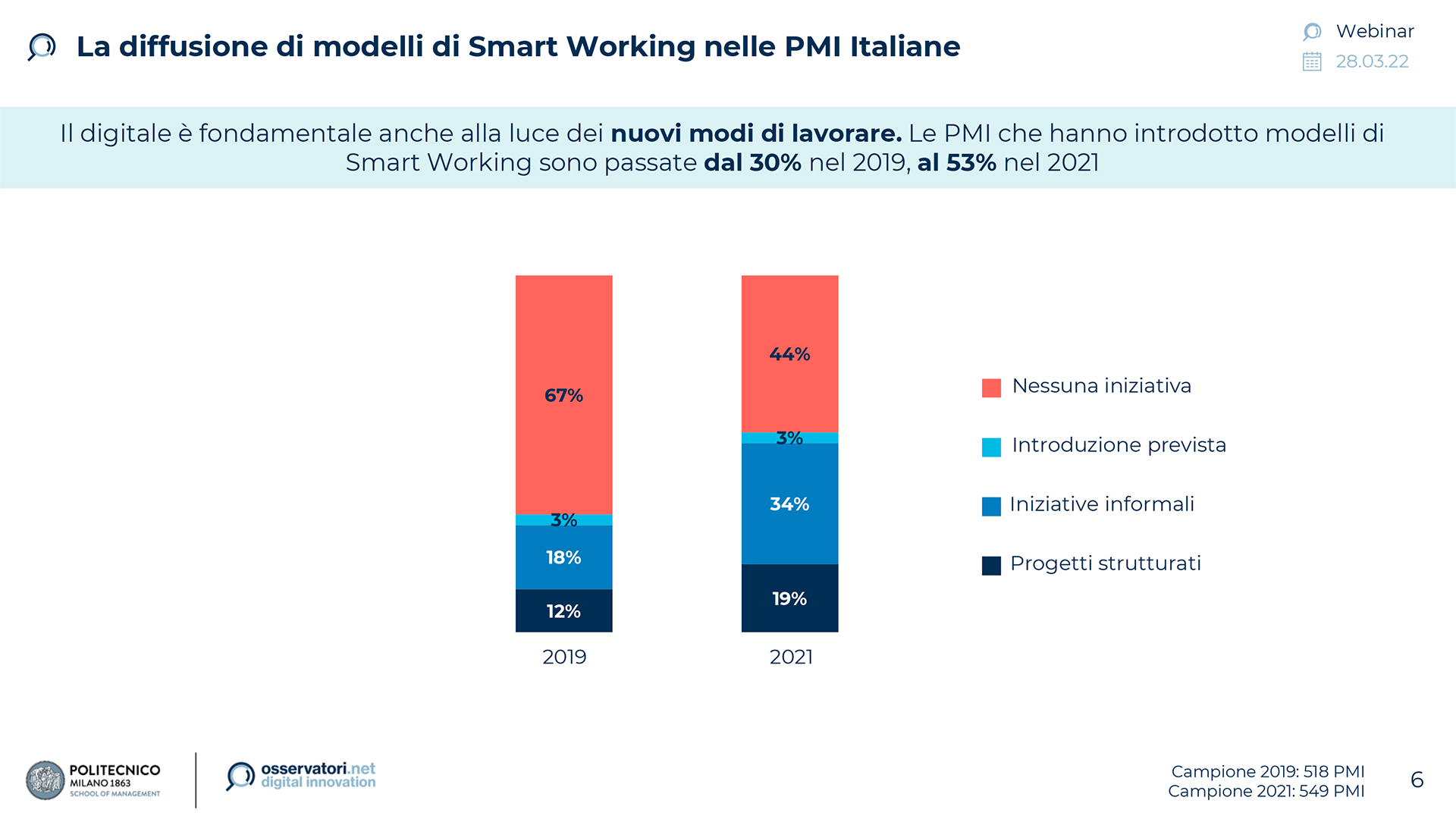 Ma che cosa è successo con la pandemia? A questa domanda Mariano Corso ha risposto senza alcuna esitazione: «Un ruolo centrale nella diffusione del digitale nelle PMI lo ha avuto senz’altro lo Smart Working. Nato come una necessità durante la pandemia, ha portato le imprese, anche quelle di piccole e medie dimensioni, ad applicare nuovi modelli di organizzazione del lavoro in modo strutturato o, molto più spesso, in modo destrutturato. Se prima 2 PMI su 3 non mostravano interesse e conoscenza rispetto al lavoro agile, oggi oltre la metà (53%) ha fatto questo salto. Questo è un presupposto importante per la transizione al digitale».