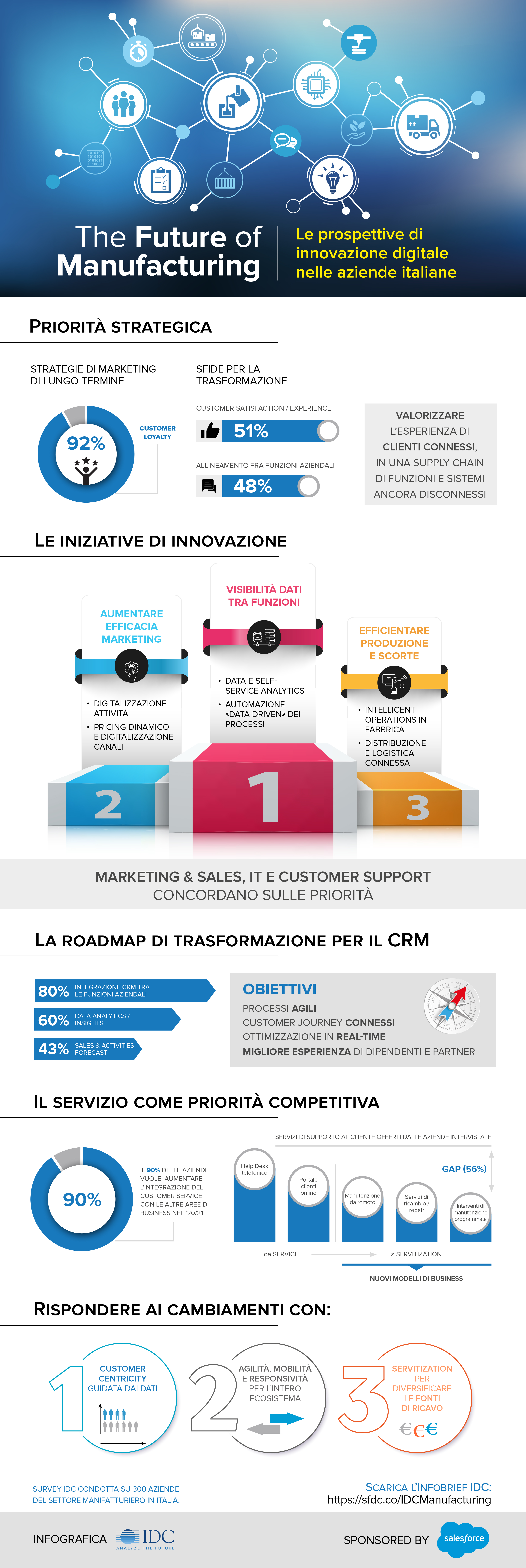 Per questo smart manufacturing è anche sinonimo di servitization: un modello servizio-centrico che integra il complesso ecosistema di attori della Supply Chain per farli lavorare in maniera armonica alla massima soddisfazione e conseguente fidelizzazione del cliente. La premessa è capire ogni tipo di dato relativo al cliente: non solo quelli a consuntivo, ma anche quelli di tipo predittivo: ordini, rincociliazioni, insoluti, resi ma anche rallentamenti o scostamenti rispetto alle pipeline di vendita, così come chiamate agli help desk, reclami o qualsiasi altro evento dello storico della relazione che può includere persino i post social.