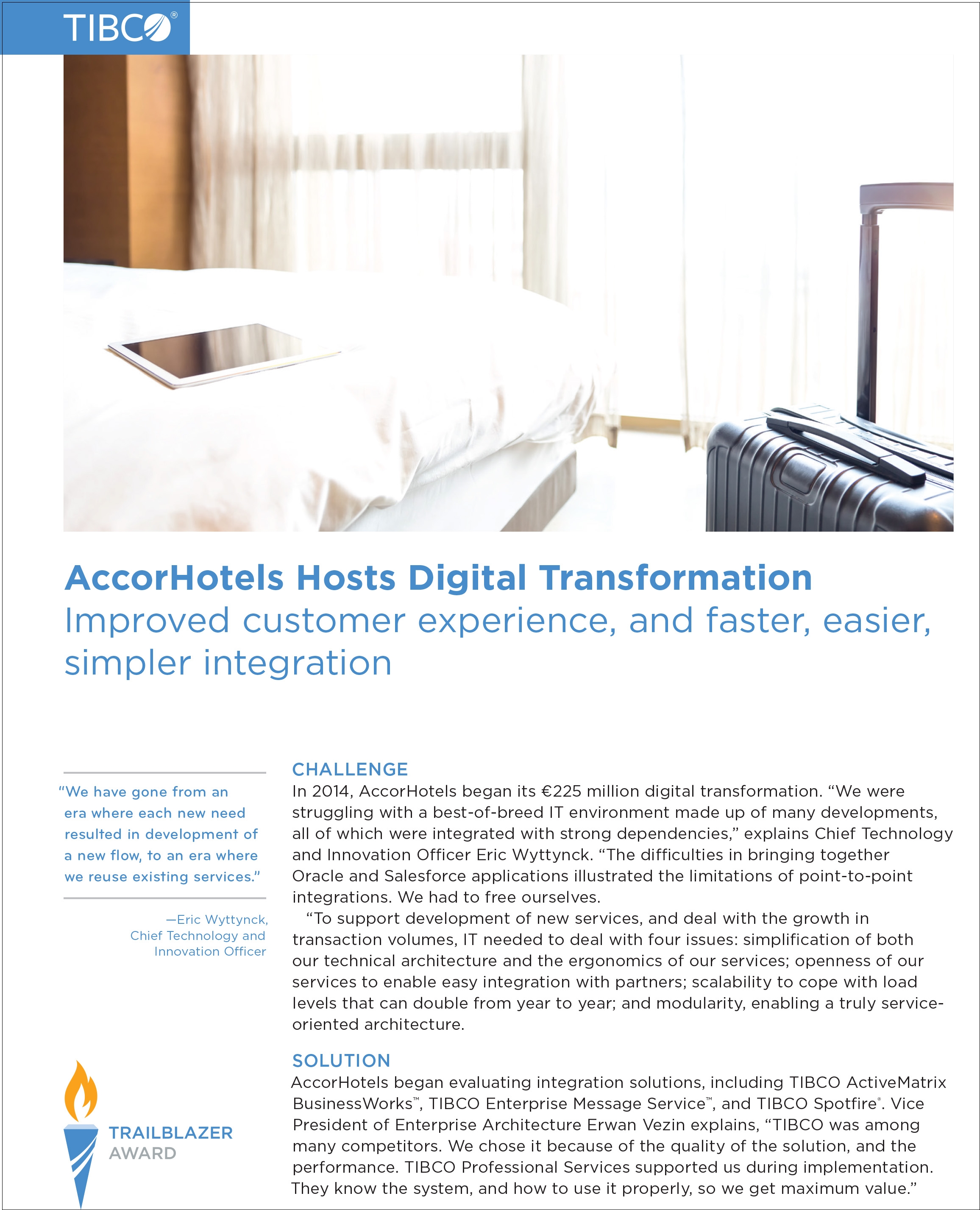 Il gruppo alberghiero francese AccorHotels, nelle fasi iniziali della sua trasformazione digitale, si è trovata in difficoltà a causa di un ambiente IT best-of-breed composto da molti elementi applicativi, tutti integrati e con forti dipendenze. Le complessità riscontrate nel tentare di riunire applicazioni di marchi differenti hanno messo in evidenza le limitazioni delle integrazioni point-to-point.