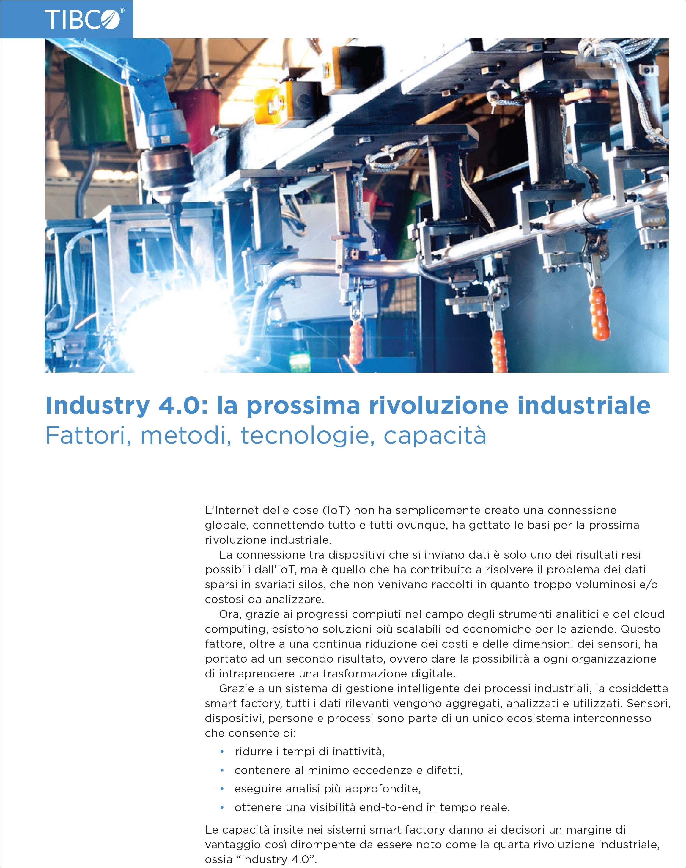 Questo white paper, fornito da TIBCO, spiega quali sono le pratiche che le aziende produttrici orientate alla smart factory dovrebbe mettere in atto per implementare le tecnologie che stanno alla base dell’Industria 4.0.