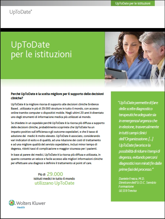 Oggi la tecnologia costituisce un asset fondamentale per tutte le realtà sanitarie nazionali e internazionali. In questo documento, realizzato da Wolters Kluwer, vengono spiegate nel dettaglio tutte le funzionalità di UpToDate, uno strumento a supporto del Clinical Decision System.